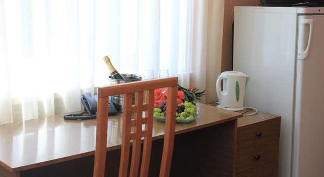 В числе удобств полулюкса — гостиная зона, телевизор и собственная ванная комната с душем.